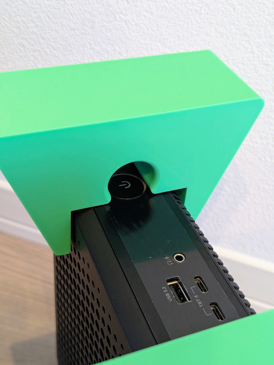 ということで、完成形がこれだ。50mmほど高さを稼いで、底面となってしまう前面インターフェースもギリギリ利用できるように工夫。また、電源ボタンをどう延長するかギミックを考えていたのだが、うまく動かず試行錯誤を繰り返すくらいなら、シンプルに穴を開けてしまえという結論に。これにより、外側からも内側からも電源ボタンが押せるようになった。