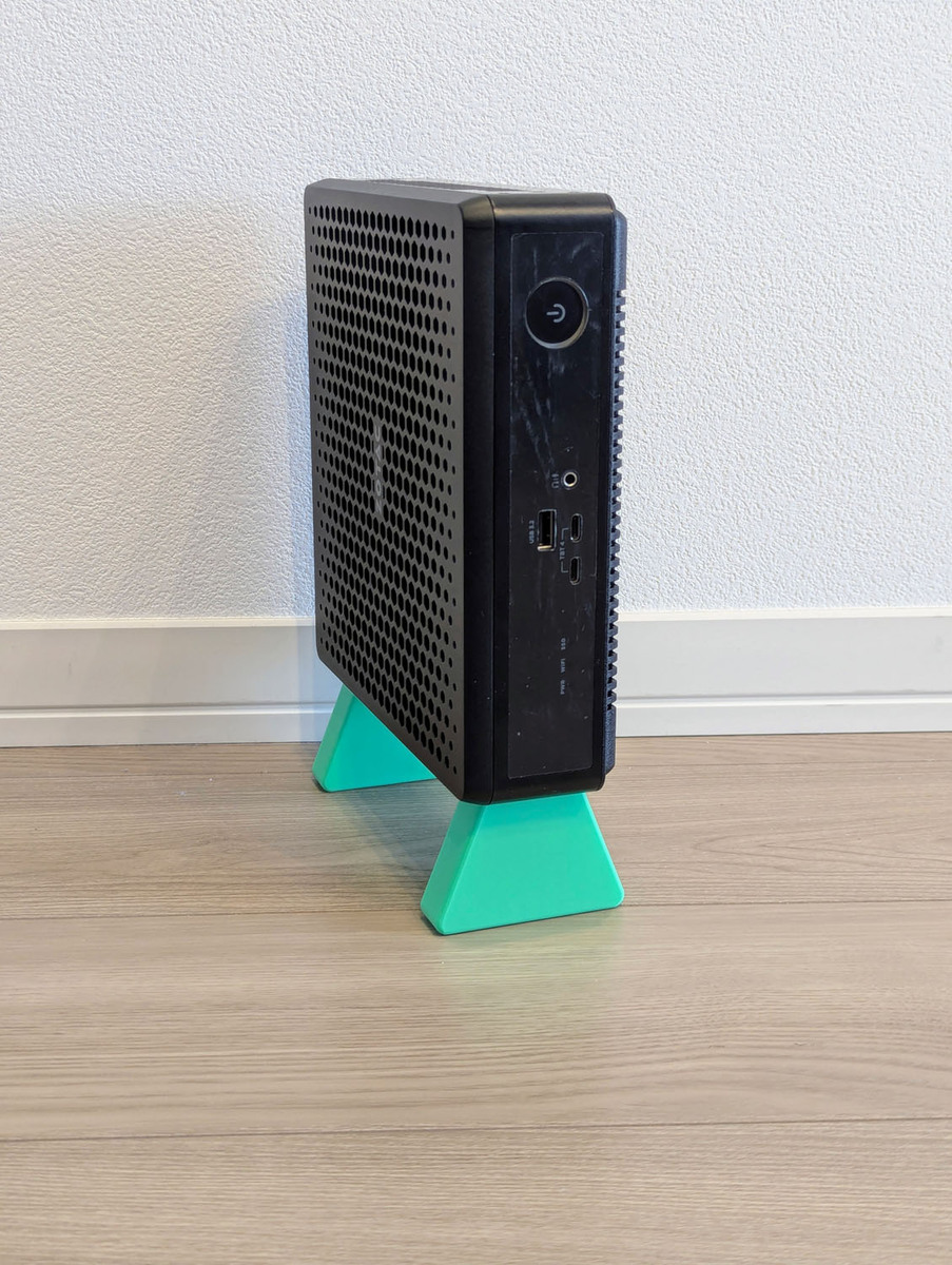 ここまでは、あくまで壁掛けから派生した方法での縦置きを探っていたが、そもそもの目的は、吸排気口をふさがずに縦置きできること。それなら、もっと直接的な方法があるということに気づいた。そう、直接「足」を作ってしまう方法だ。木片などを加工してもいいのだが、手元に3Dプリンターがあったのでこれを使って作ってみよう。