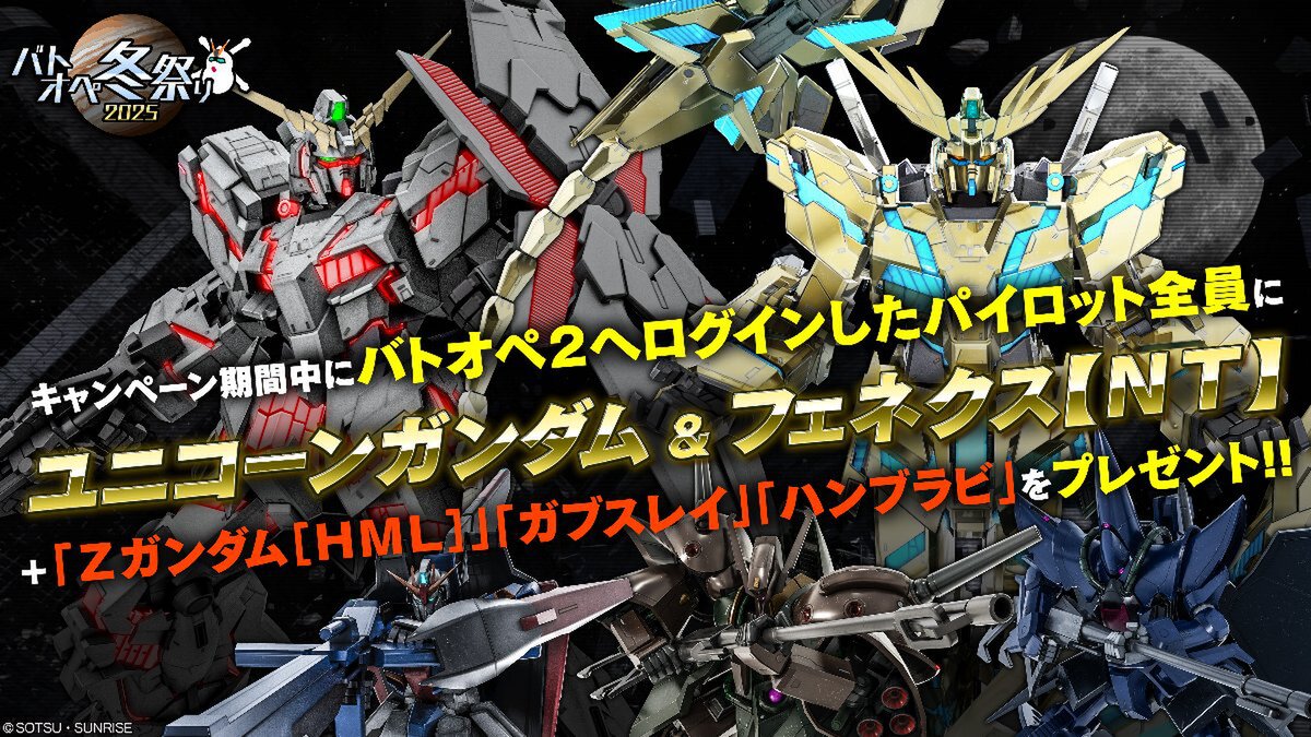 現在、「バトオペ冬祭り2025」が開催中。期間中はログインボーナスとして「ユニコーンガンダムLV1」「フェネクス【NT】 LV1」を配布するほか、COST750機体である「ガブスレイLV4」「ハンブラビLV4」「Zガンダム[HML] LV3」も主兵装とともに配布している。