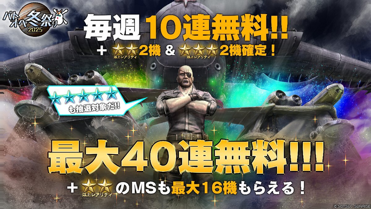 また、★2以上のMS2機と★3以上のMS2機が確定で手に入る毎週10連無料抽選配給を実施しているので、この機会をお見逃しなく。「バトオペ冬祭り2025」実施期間は、2026年1月1日13時59分(予定)まで。
