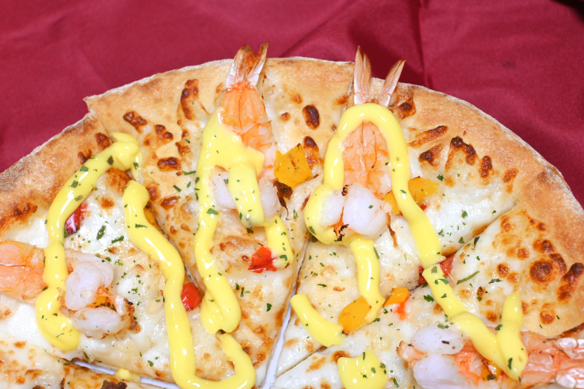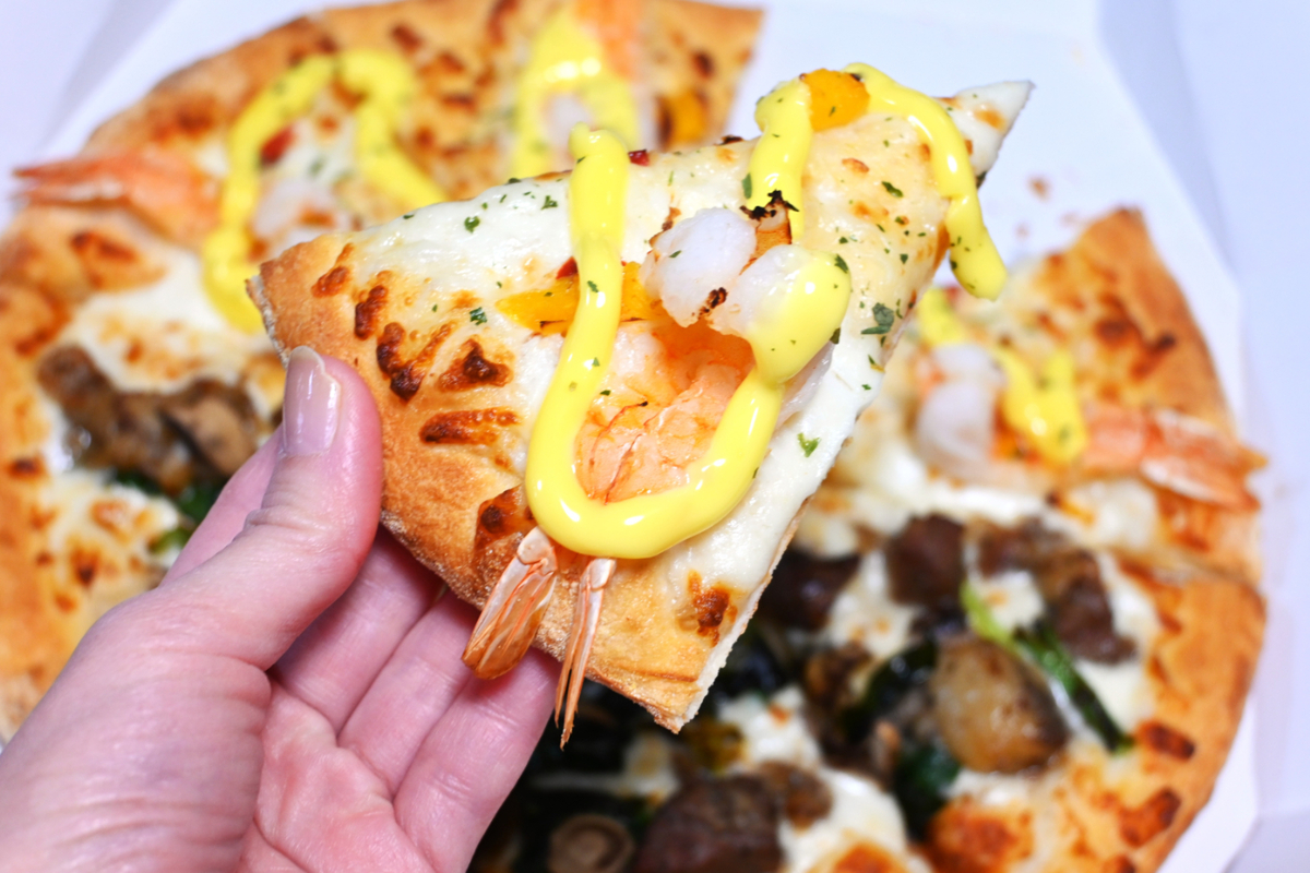 公式画像では、海老の尾が生地から大胆に飛び出しているのが印象的でしたが、実際の商品も控えめながら、しっかり外にちょこんと飛び出しています。デリバリーピザで具材が生地をはみ出すこと自体が珍しく、思わず写真を撮りたくなるビジュアルです。