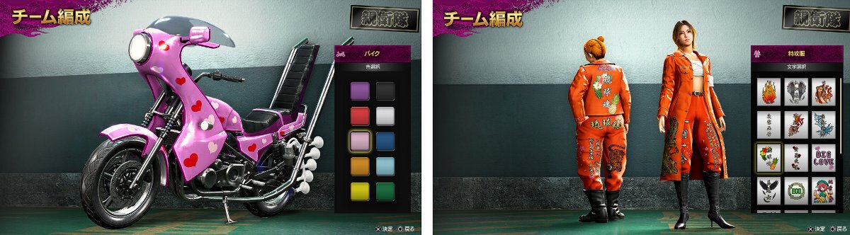 4つの部隊のそれぞれの特攻服やバイクは、部隊ごとに見た目をカスタマイズすることが可能。色や柄を自由に設定できるほか、特攻服については背中にさまざまな気合の入った言葉を刻める。