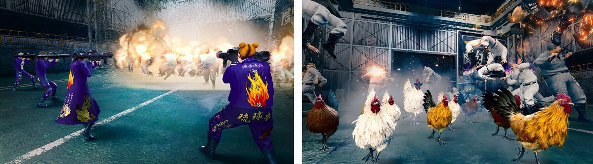 さらに、血闘で使える「ツッパリ兵器」も購入可能。味方が撃つロケットランチャーのほか、敵陣へ突入するニワトリなどさまざまなユニークな兵器が登場する。お金を使ってチームの戦力を整えよう。
