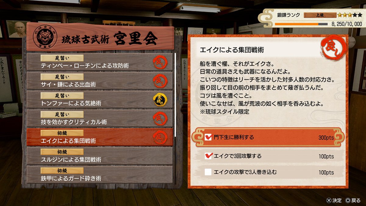 ミヤさんが師範をつとめる宮里道場では、さまざまな稽古を受けることができ、琉球スタイルの戦い方をはじめとしたバトルのいろはを学べる。さらに、稽古を続けていると昇級試験に挑戦でき、晴れて合格できれば、ミヤさんから宮里流秘伝の奥義を伝授してもらえる。