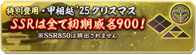 SSRは初期威名900のみ排出される「特別登用・甲相越 ‘25クリスマス」を開催。開催期間は、2025年12月25日12時59分まで。