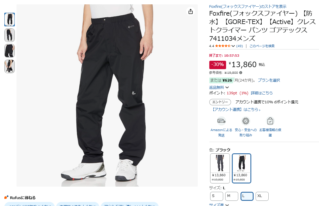 ゴアテックス搭載の高機能レインパンツFoxfireの「クレストクライマー」が、現在Amazonでは30%OFFの13,860円で購入できます。