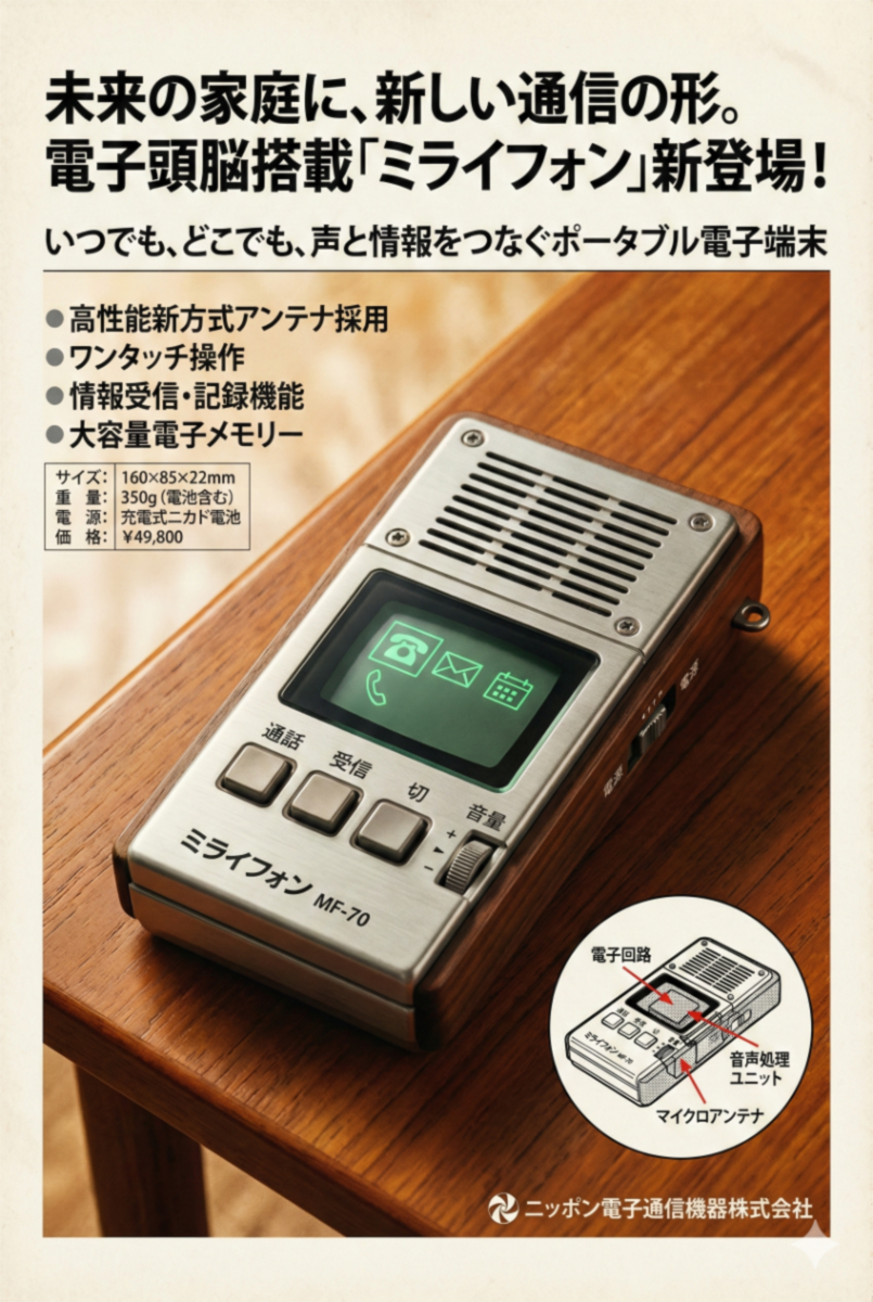 木目調のテーブル、ブラッシュメタルの本体、グリーンの蛍光ディスプレイ、物理ボタン、スピーカーグリル——すべてが1970年代のデザイン言語で表現されている。広告レイアウトも完璧で、「未来の家庭に、新しい通信の形」「電子頭脳搭載『ミライフォン』新登場!」というコピー、スペック表、価格(¥49,800)、架空の企業名(ニッポン電子通信機器株式会社)まで、当時の広告を完全再現している。