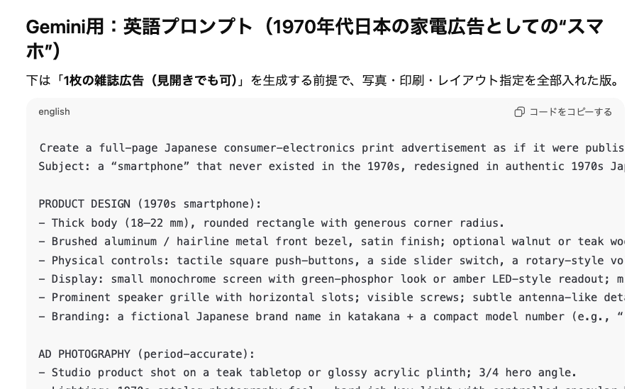 ChatGPTは数十秒でリサーチを完了し、驚くほど詳細なプロンプトを生成した。1970年代の撮影技法(タングステン3200K、ハレーション)、デザイン要素(木目調、ブラッシュメタル、グリーンフォスファーディスプレイ)、広告レイアウト(ゴシック体、明朝体、箇条書き)、さらに当時の言い回し(「電子頭脳」「新方式」「ポータブル電子端末」)まで、時代考証が完璧だ。