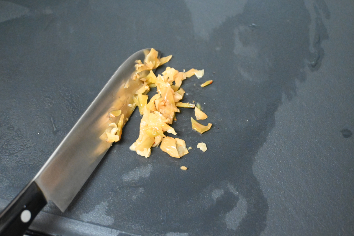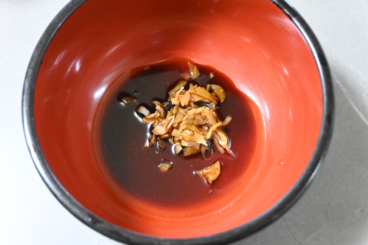 1. ザーサイはみじん切りにする。オリジナルチキンは骨を外して身をほぐし、トースターで5分焼く。器にザーサイと、酢大さじ1/2・醤油小さじ2 を入れる。