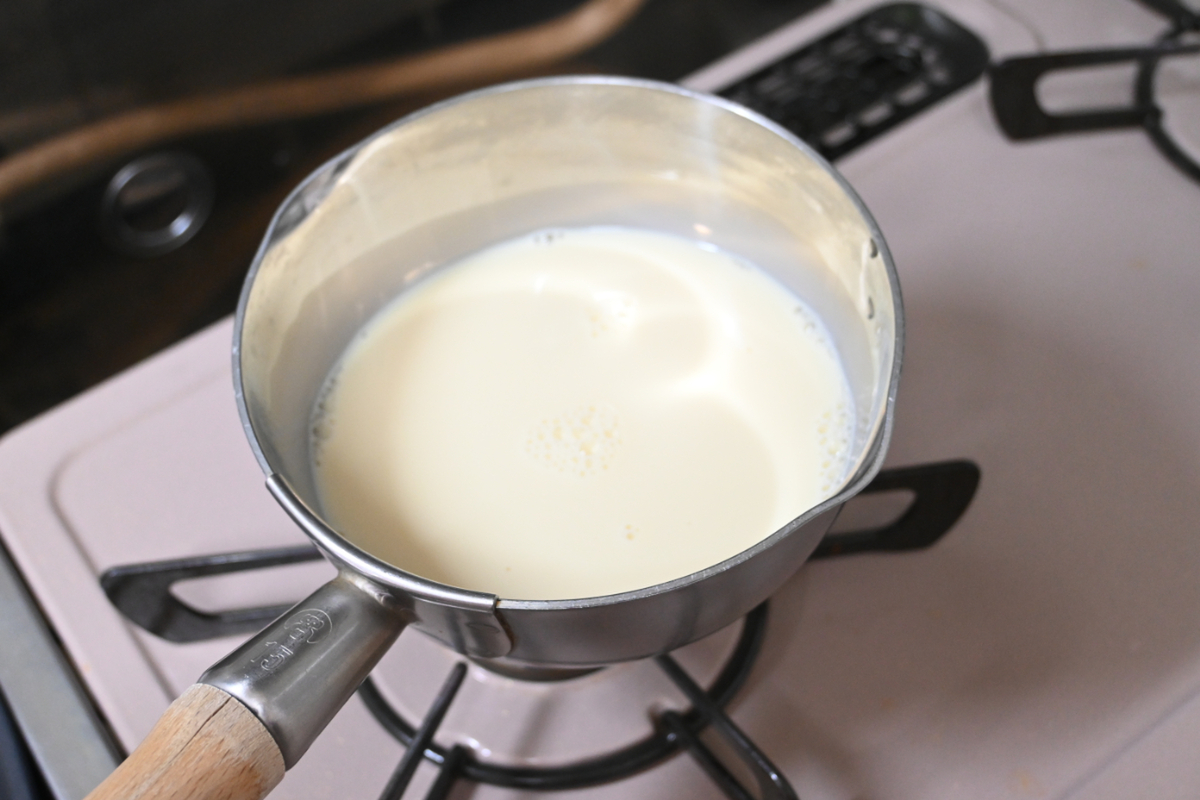 2. 小鍋に豆乳を入れて中火にかけ、沸騰する直前まで温めたら器に少しずつ注ぐ。