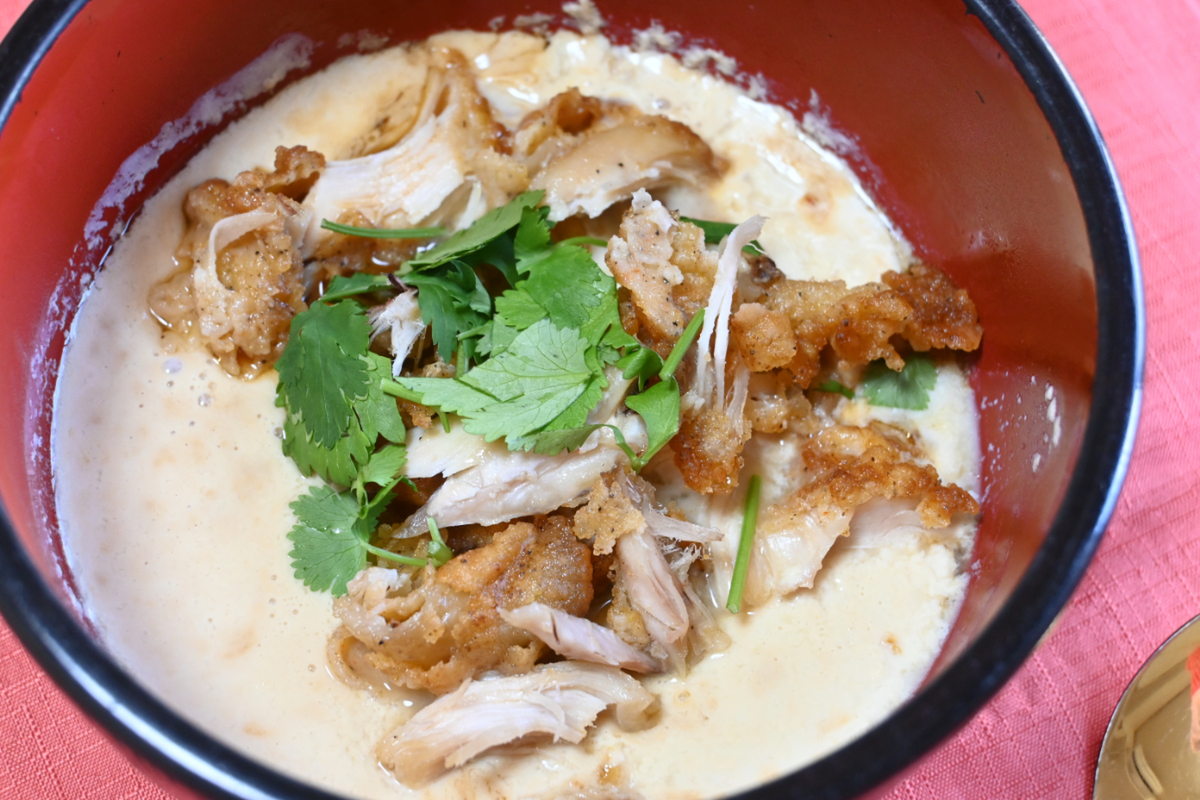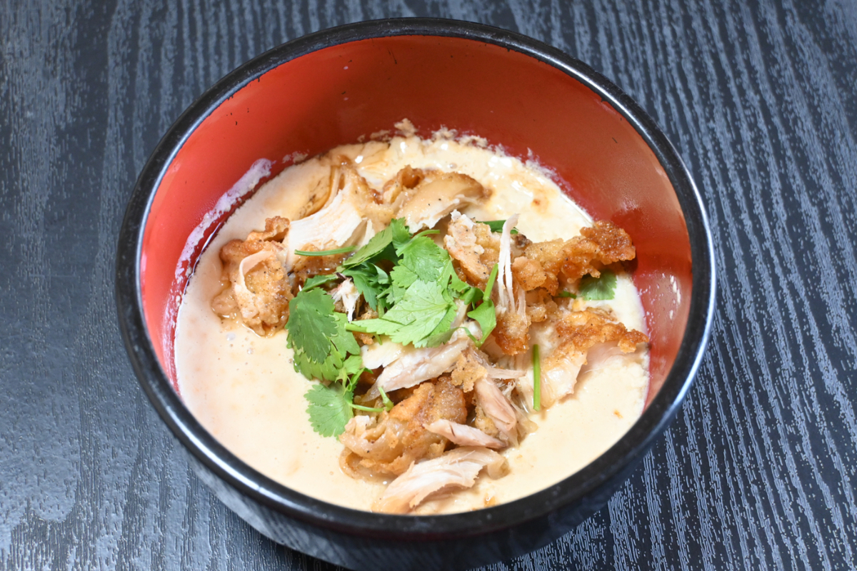 ザーサイを刻んで、酢と醤油を加え、アツアツの豆乳を注ぐ。すると、酢の“酸”によって豆乳がおぼろ豆腐のような状態に固まるんですね。そこに、チキンをのせて、パクチーを添えてできあがりです。