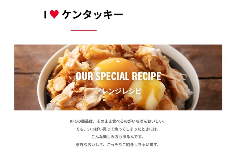 KFCの公式サイト内の「I♥ケンタッキー アレンジレシピ」では、様々なオリジナルチキンのアレンジレシピがのっています。かつてアスキーグルメでも、ここで紹介されている“チキンの炊き込みご飯”に挑戦してみて、とてもおいしく作れましたよ。(関連記事:生放送で「ケンタの炊き込みご飯」を作ってみよう!! おいしい?)
