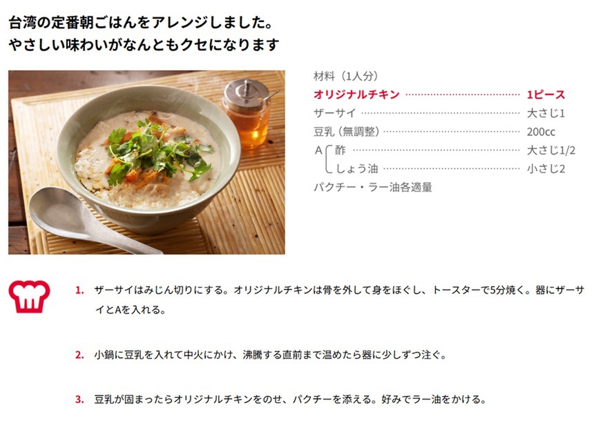 今回は、「オリジナルチキンの豆乳スープ~鹹豆漿風~」に挑戦。台湾の朝ごはんの定番「鹹豆漿(シェントウジャン)」風のアレンジを、ケンタのチキンでできるというのです。