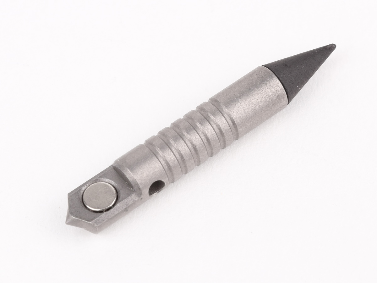 定規とは異なりますが、さらに便利機能として4つほど搭載しています。その1つが、マグネットペン。ボディに内蔵されている磁石で貼り付いているもので、紙や木材、革などに書くことができます。