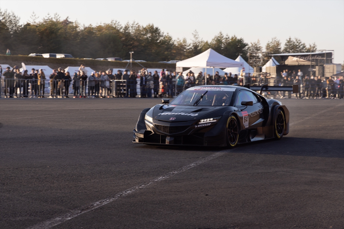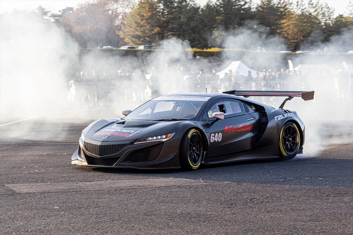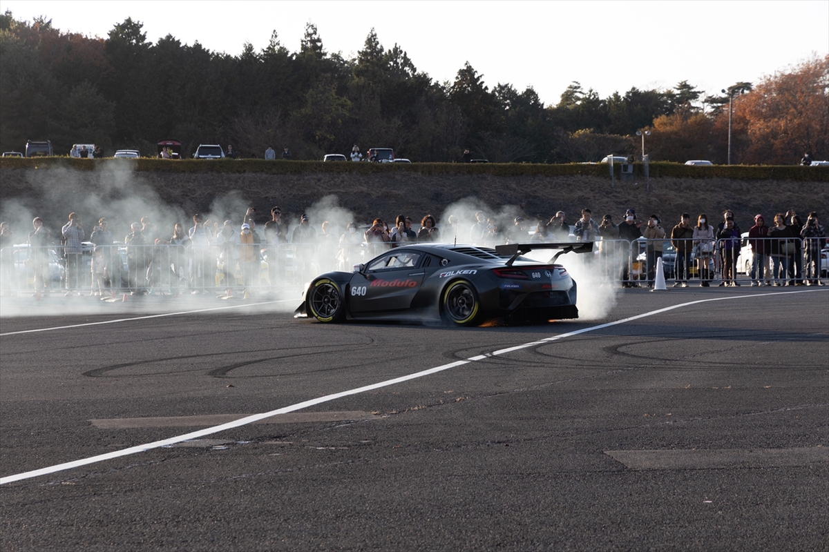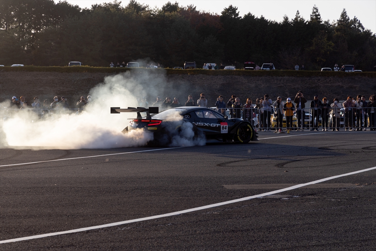 迫力のデモランも実施。まずは大草りき選手が、NSX GT3でドーナツターンを披露。あっという間に会場は白煙で何も見えない状態になりました。