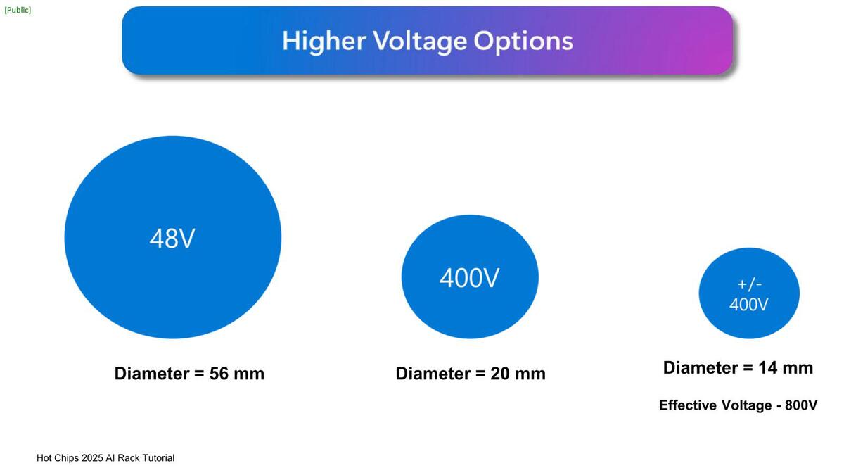 もう1つの理由は、もはや48Vでは配線が困難なためである。下の画像は500kWの電力供給に必要な配線の太さを示したものである。