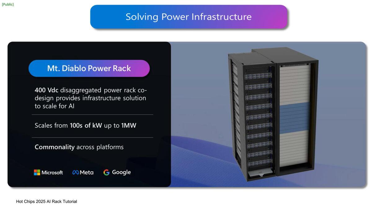 ただし、高密度サーバーになると、もうラック内に電源ユニットを収めるのは難しくなるので、サーバーラックの脇に電源供給用のラックを並べよう、というのがOCP(Open Compute Project)でMt.Diabloとして標準化が進められている案である。