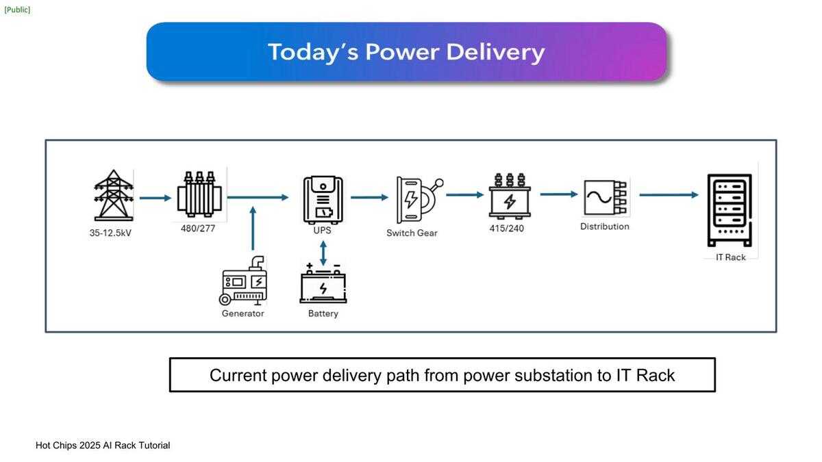 さてそのラックへの電力供給であるが、従来の一般的なシステムでは高圧線から電力を引き込み、AC200V前後の形でラックに供給、ラック内で54V DCに変換した上でラック内のシャーシに供給するというパターンであった。
