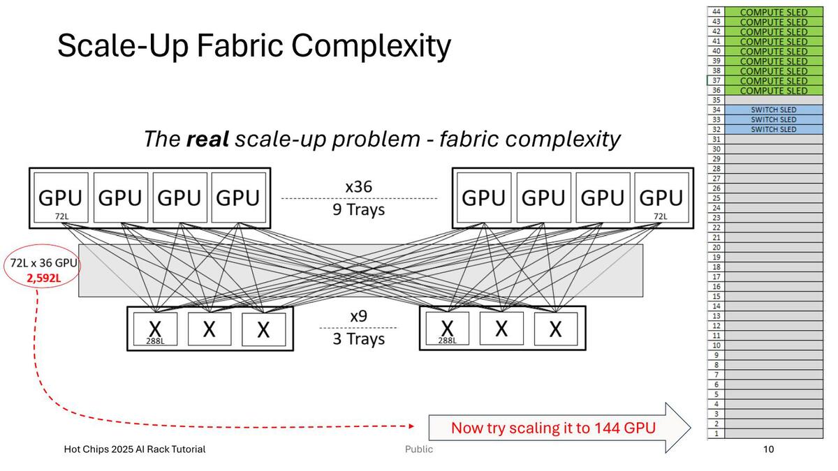 例えば下の画像はNVL72の模式図であるのだが、NVIDIAは次世代でRubinベースのNVL144の提供を予定しており、配線もおそろしい(1万368本のNVLinkによる相互接続になる)うえ、スイッチだけで12本ものシャーシを占有することになり、Scale-upの限界が近いとしている。