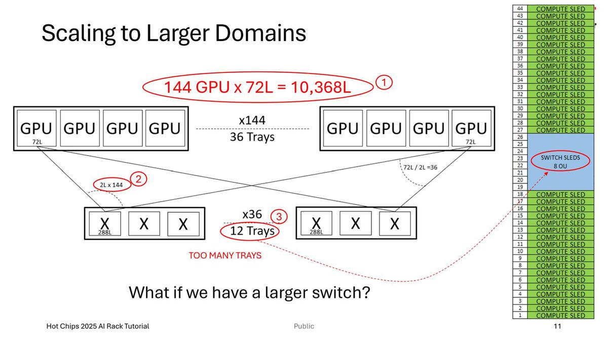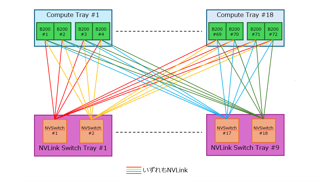 NVL72の模式図。これはAMDのDarrin Vallis氏(Datacenter Solution Architect)の"Scaling fabric technologies"という講演のスライドなので、当然NVIDIAとNVL72といった名前は出てこない