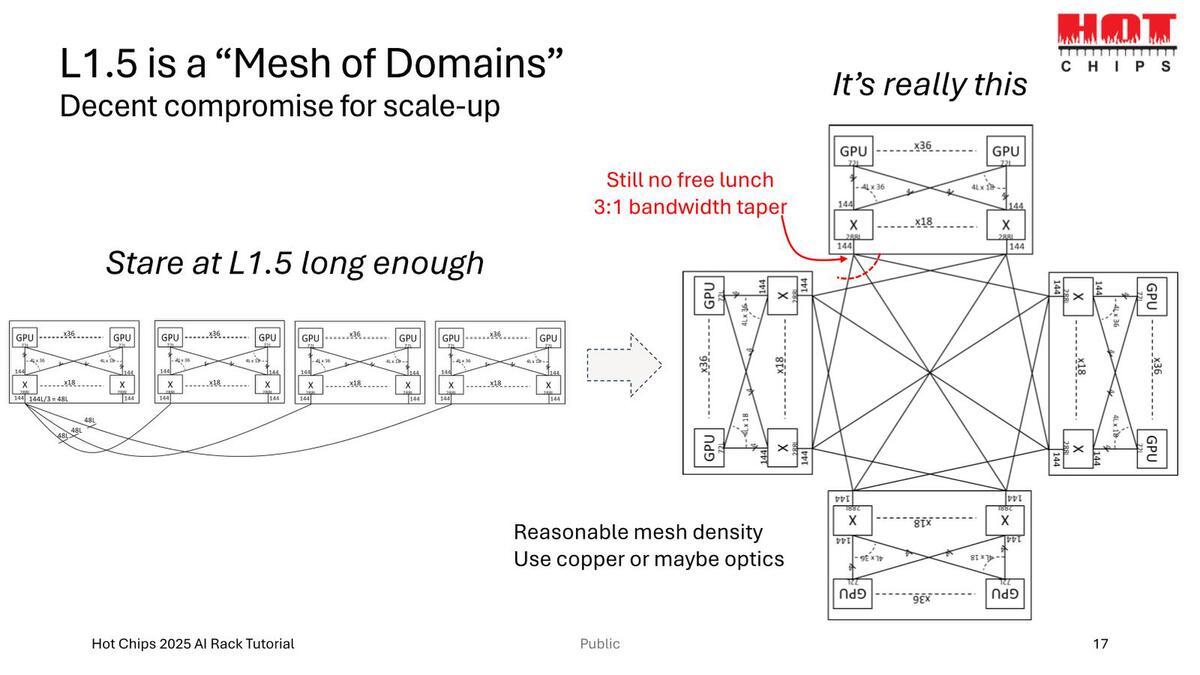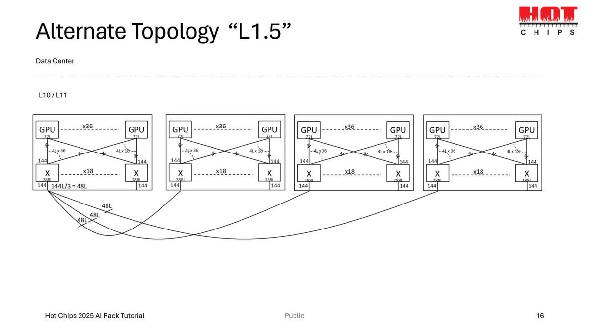 ちなみに解決案の例として提示されたのがL1.5という、スイッチ同士の相互接続をともなうアイディアである。ではNVIDIAは次世代のRubin Ultraでどうするつもりなのかを次回説明したい。