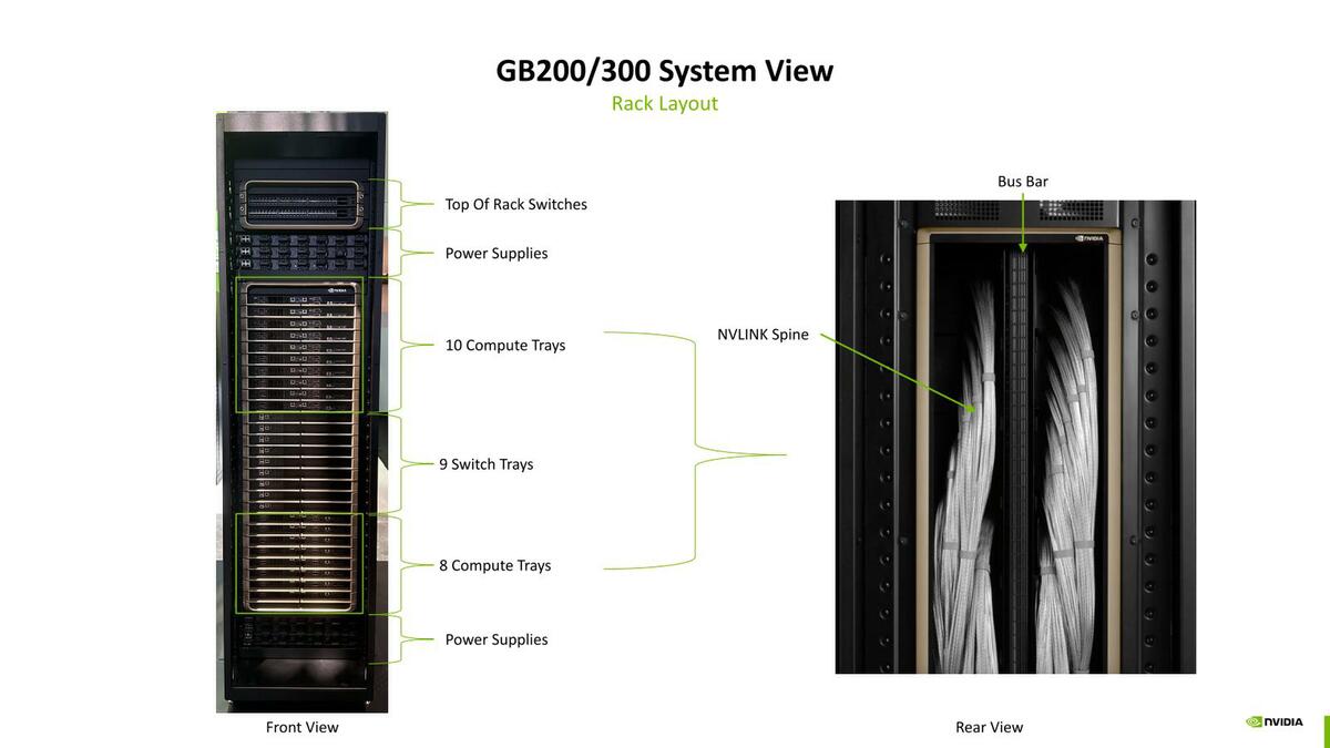 前回のNVL72のNVLink接続図でも説明したが、たかだか72台のGPU同士の接続に必要なNVLinkの本数は1296本。前回は説明しなかったが、NVLinkは当然双方向であり、かつ電気信号ベースということで1リンクの配線本数は、DifferentialかつBi-Directionalなので4本であり、電線本数は4倍の5184本に達する。