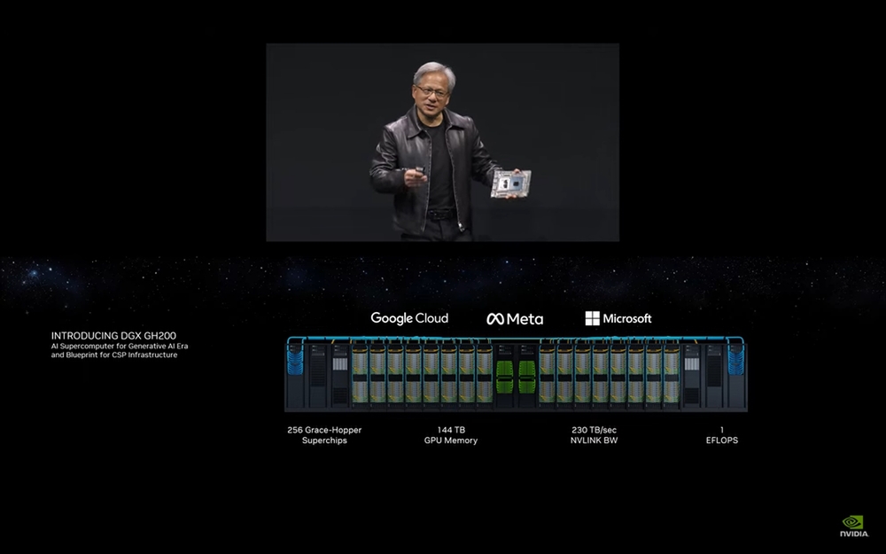 72台のGPU同士でこれなわけだが、昨今のクラウド推論の動向では、さらに大規模な構成が要求されつつある。やや前の話になるが、2023年5月にNVIDIAがDGX GH200 AI SuperComputerを発表した。構成は下の画像のように、GH200を16枚装着したラックを16本並べた構成である。