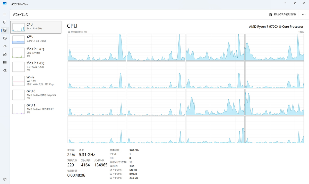 CPUのRyzen 7 9700Xは、8コア/16スレッドなのが大きなポイントになる。CPU負荷の高いゲームはもちろんのこと、ゲームプレイ中の録画や録画した動画の編集といったクリエイティブな作業もサクサクと進められる。