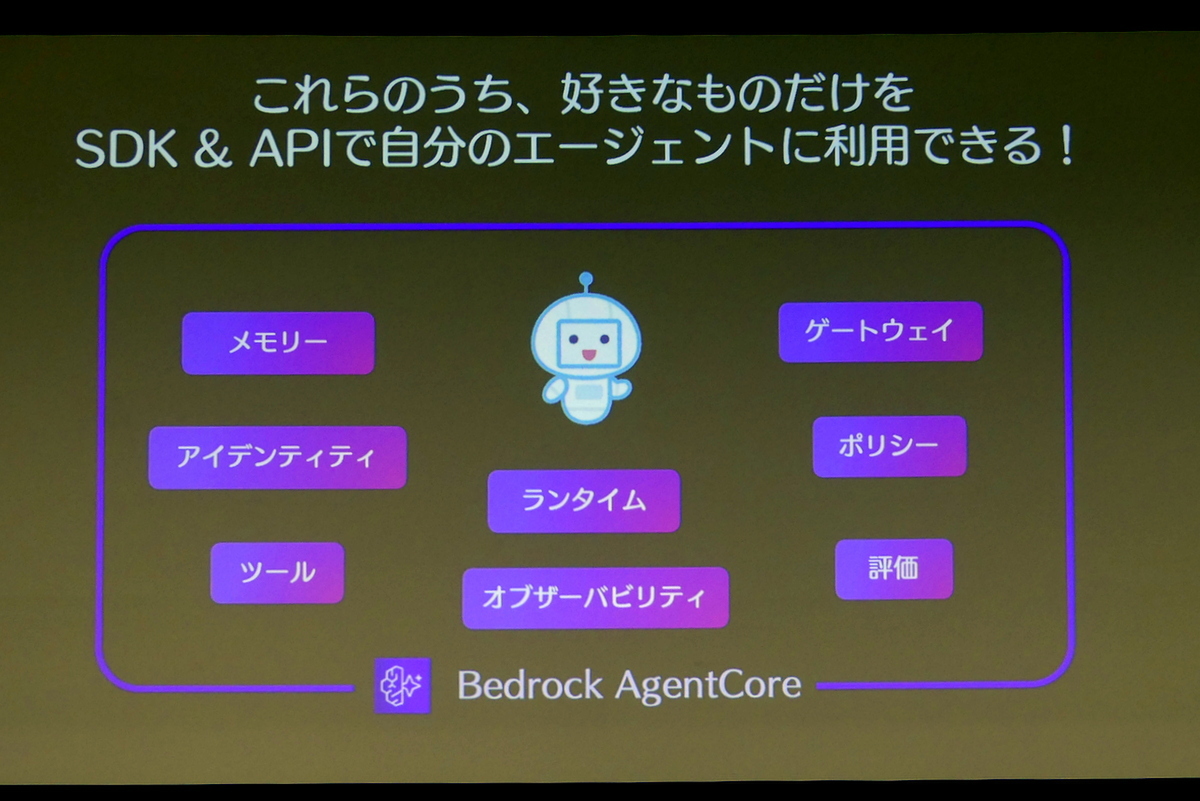 こうしたニーズに応えたのが、AIエージェントの動作環境を提供する「Amazon Bedrock AgentCore」になる。AgentCoreには、エージェントをサーバーレスで動かせる「AgentCore Runtime」、記憶を持たせる「AgentCore Memory」、必要なツールとの連携を容易にする「AgentCore Gateway」、認証・認可を担う「AgentCore Idenitity」、ツールの統制を行なえる「AgentCore Policy」、ブラウザ操作やコードインタープリターなどのビルトインツール群、利用度の評価を行なう「AgentCore Evaluation」、エージェントの行動を関する「AgentCore Observabilities」などのAIエージェントに必要なさまざまな機能が用意されており、必要に応じて組み合わせることができる。