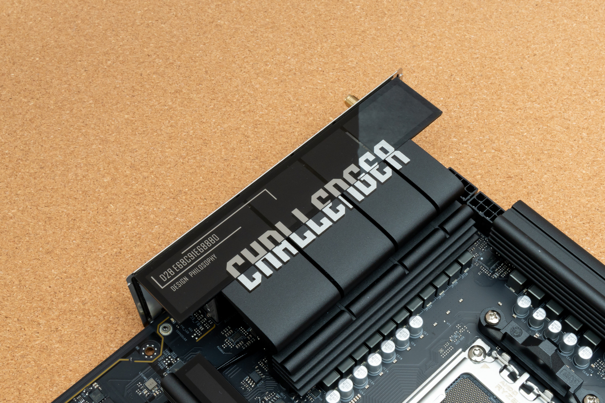 オールブラックだが、リアインターフェースカバーには、「CHALLENGER」の文字が大きく入っているほか、アクリルプレートが取り付けられている。LEDファンを組み合わせた際に、光りを反射して内部を彩ってくれそうだ。
