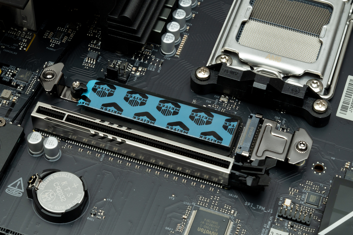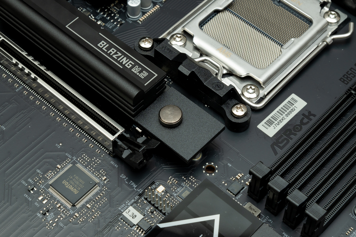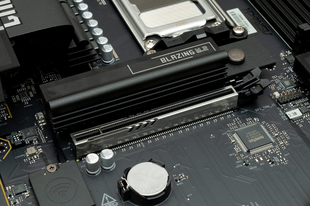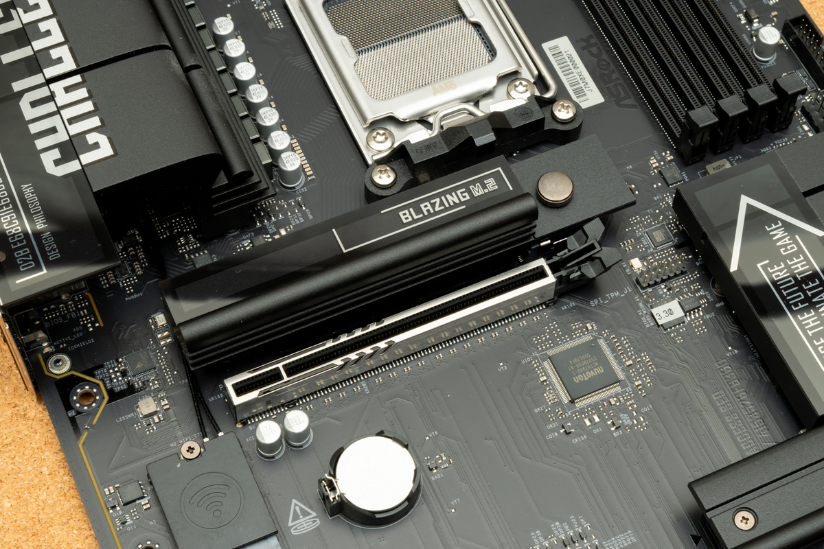 PCIe5.0×4動作に対応する「Blazing M.2 ソケット」。大型ヒートシンクを備えるのが高評価のポイント