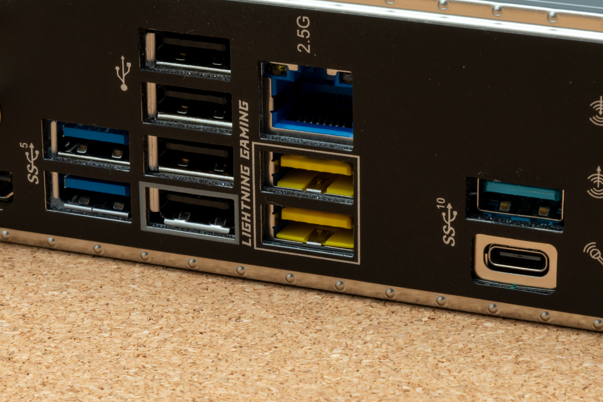 2基の黄色いUSBポートは「ライトニングゲーミングポート」になる。USBコントローラーを物理的に分けているため信号の混線が少ない。高ポーリングレートのキーボードやマウス、ゲームパッドに最適だ
