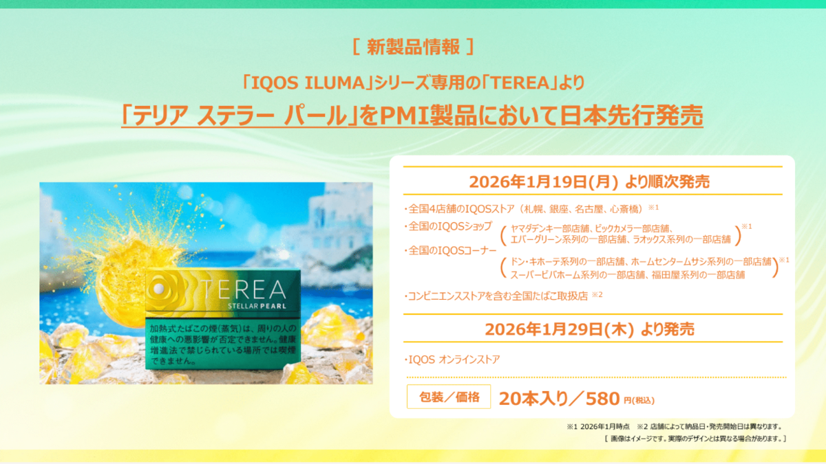 フィリップ モリス ジャパンは1月13日、加熱式たばこ「IQOS ILUMA」シリーズ専用たばこスティック「TEREA」から、「テリア ステラー パール」を発表した。日本先行発売となり、1月19日から順次発売予定。