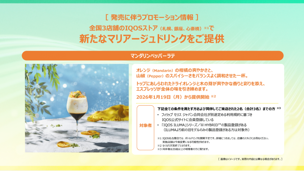 また、全国3店舗のIQOSストア(札幌、銀座、心斎橋)では、対象のユーザーと同伴して来店した2名(計3名)に新たなマリアージュドリンク「マンダリンペッパーラテ」を提供する。対象のユーザーは、フィリップ モリス ジャパンが別途定める利用規約に基づき、IQOS公式サイトに会員登録をしている、IQOS ILUMAシリーズおよびlil HYBRIDの製品登録がある人となる。