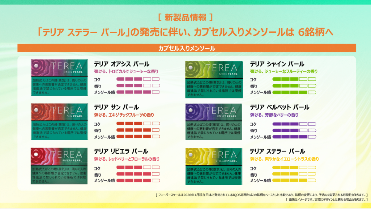 テリア ステラー パールは、カプセル入りメンソールのカテゴリーで、このカテゴリーでは6銘柄目となる。爽やかなイエローシトラスの香りが特徴で、カプセルをつぶすとメンソールが広がり、爽やかなイエローシトラスが香るという。なお、TEREAシリーズはこれで全26銘柄になる。