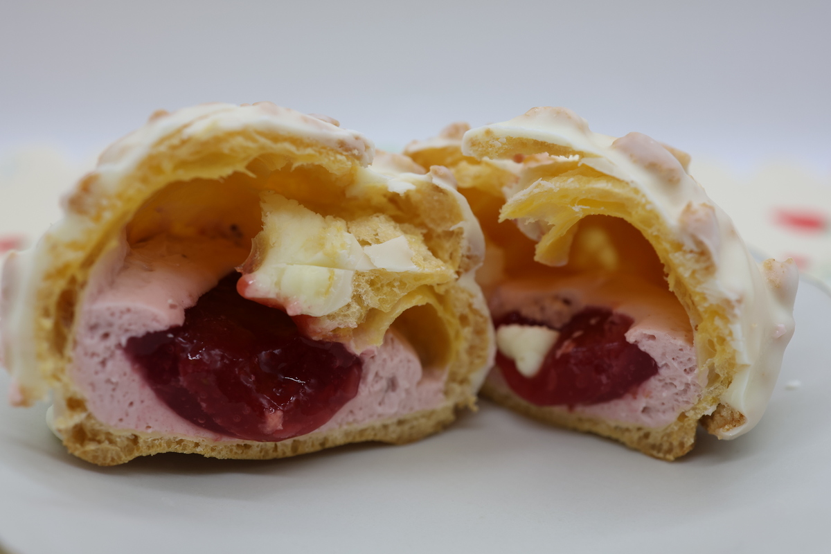 いちごクリームといちごソースの2種類の味わいが楽しめるクッキーシューです。