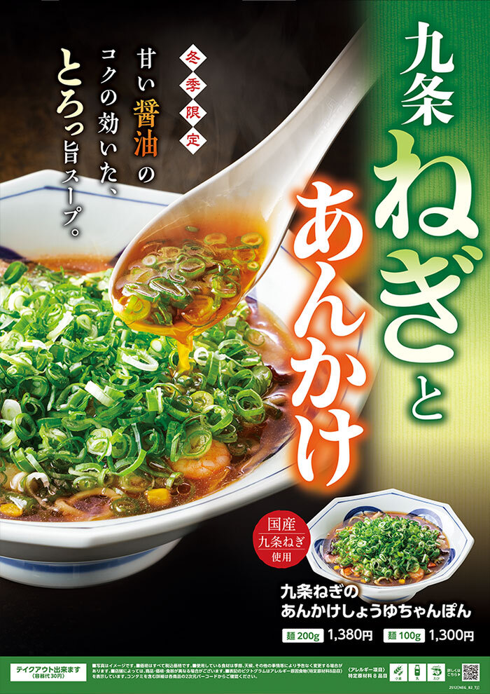 冬らしいメニューが気になる時期に、見逃せない新メニューが登場。特に「九条ねぎのあんかけしょうゆちゃんぽん」は、香ばしいねぎとあんかけでとても体が温まりそう。