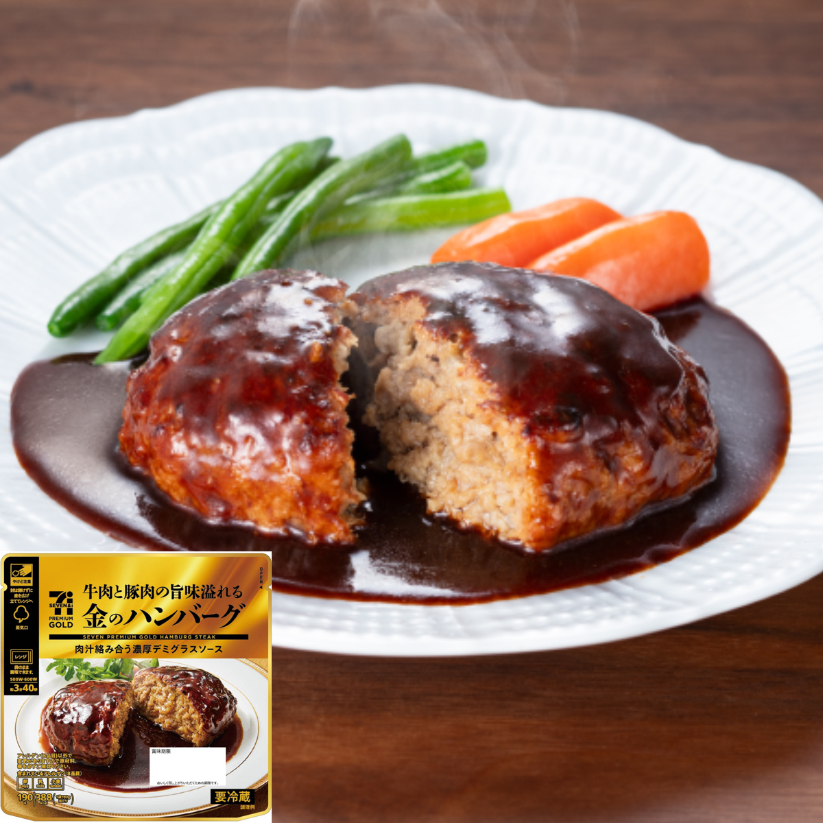 セブン‐イレブンが展開する「金のハンバーグ」は、牛肉と豚肉を使用した商品です。肉の旨味とデミグラスソースを組み合わせた構成で、全国で販売されています。
