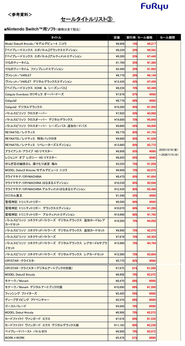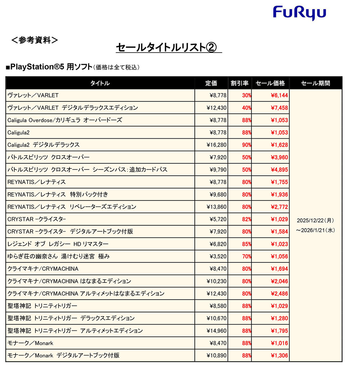 同社の最新作である学園RPG「ヴァレット/VARLET」が30%オフ、話題作「REYNATIS/レナティス」、「クライマキナ/CRYMACHINA」が80%オフと過去最大割引で提供されている。