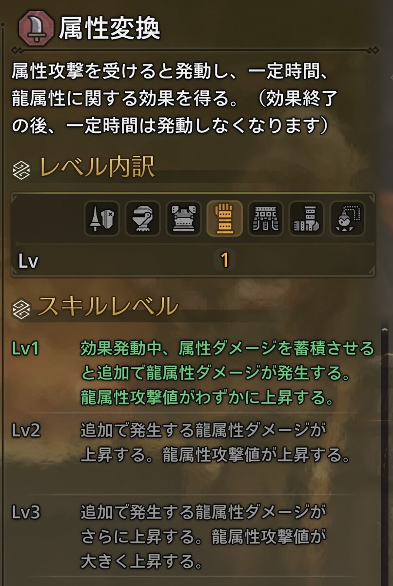 そのスキルこそが「属性変換」。効果をかいつまんで説明すると、「敵から属性攻撃を受けるとこちらの龍属性がブーストされる」というもの。今回のギミックにぴったりのスキルで注目を集めている。