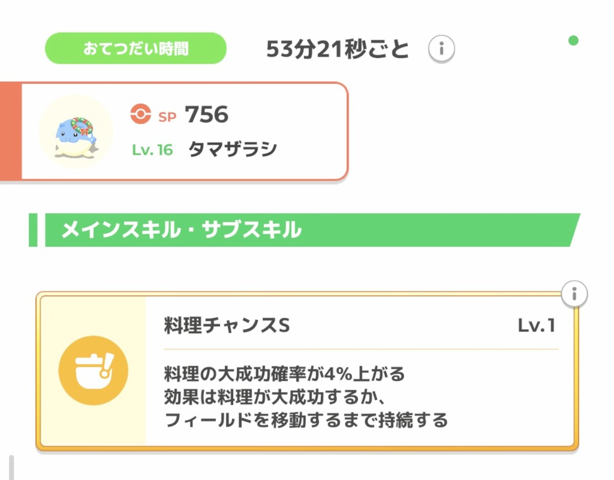 また、能力的にもタマザラシが注目されている。スキルとくいで、メインスキルが「料理チャンスS」。これは料理の大成功率をアップさせる効果を持ち、現在のポケスリ界隈でとても強力とされているものだ。同スキルを持つ「デデンネ」は捕獲するのが大変なので、厳選しやすいのもポイント。