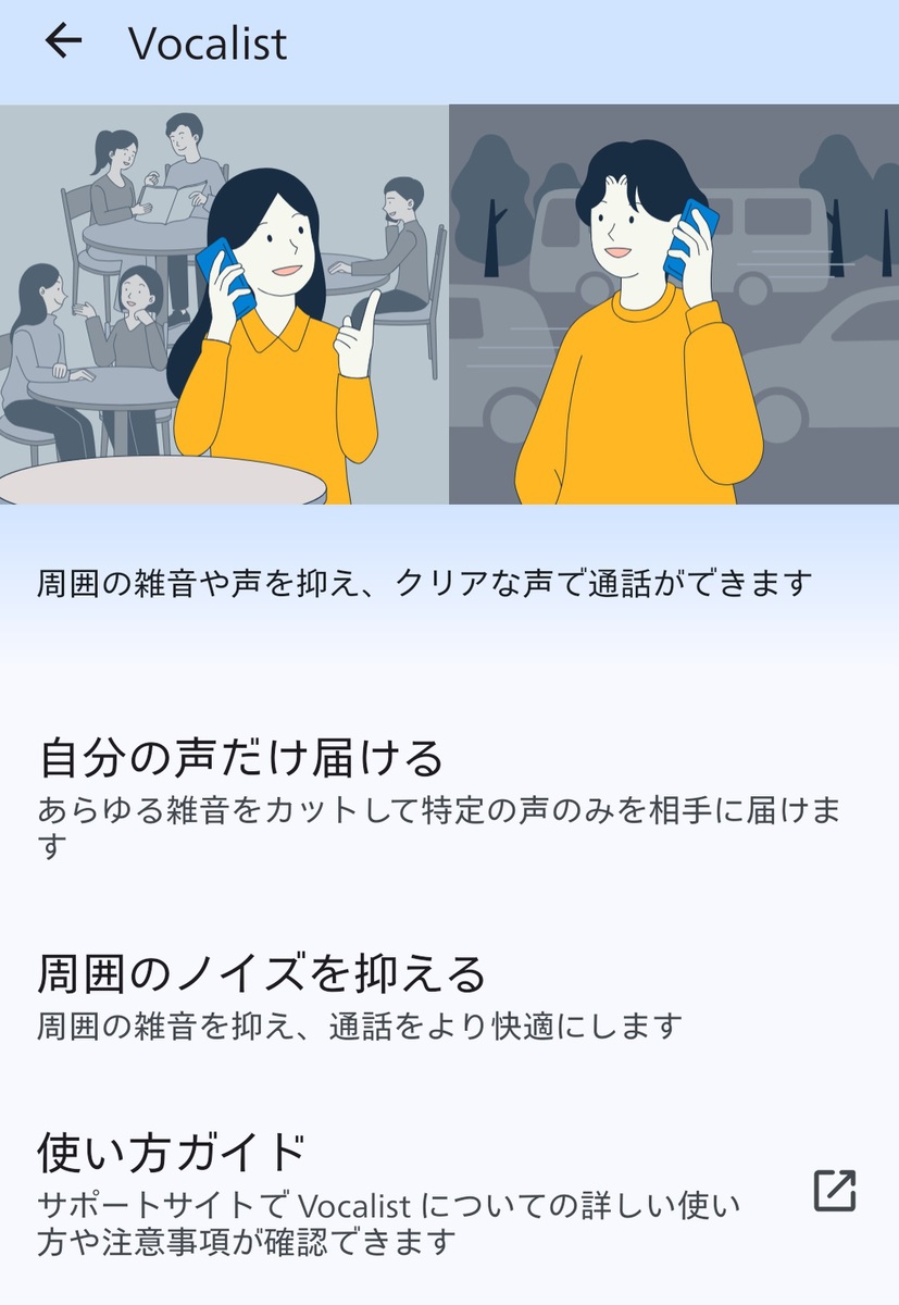 AQUOS sense10では、「電話」としての機能が劇的に進化しました。「Vocalist(ボーカリスト)」という新しいAI機能では、たとえば駅のホームや工事現場の近くなど、極端にうるさい場所で電話をしても、自分の声以外の周囲の雑音だけをAIが消し去り、クリアに相手に届けてくれるのです。また、相手の声を聞き取りやすくする機能も優秀です。
