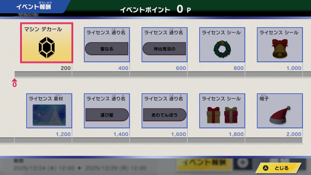 不具合を解消するには至らなかったのか、今回のイベントはルールを変更することで再開催。イベント「全員で! おなじスタジアム」をプレイすることで、サンタ帽やライセンスシールなどをゲットできる。