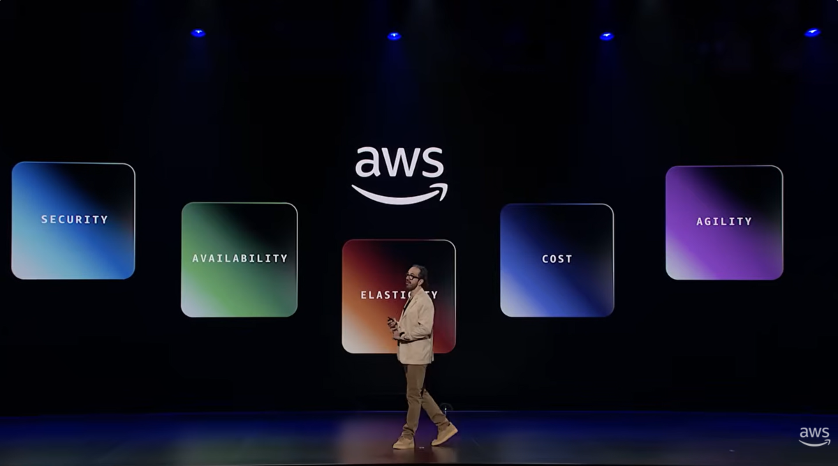 変わらないこととはなにか? デサントス氏は、テクノロジーを悪用するユーザーを前提とした「Security(セキュリティ)」、巨大なシステムを高性能・ノーダウンタイムで動かし続けるための「Availability(可用性とパフォーマンス)」、容量計画なしでシステムを拡大・縮小できる「Elasticity(弾力性)」、高価なAIを低廉なコストで提供するための「Cost(コスト)」、イノベーションや方向転換を容易に実現する「Agility(俊敏性)」という5つを掲げたスライドを掲げる。