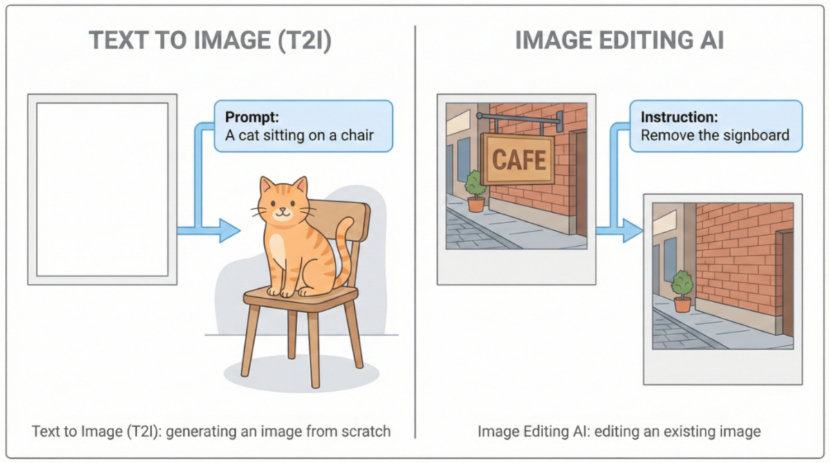 従来の画像生成AIは、白紙のキャンバスに対してテキストから画像を生成するT2I(テキストtoイメージ)が中心だった。一方で編集系AIは、すでに存在する画像を前提とし、不要な要素の削除や差し替え、背景の拡張、文字の書き換えといった処理をする。