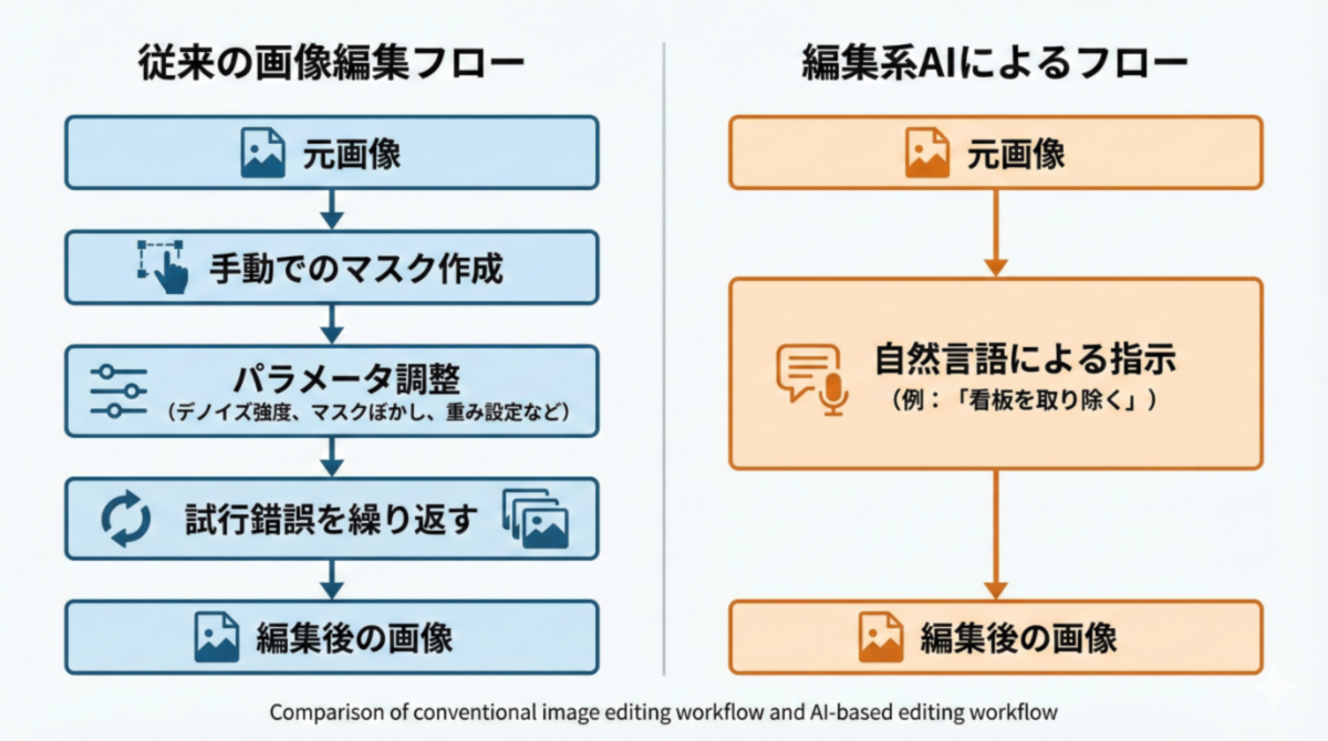 これまでの画像編集では、どこを編集するかを人間が細かく指定する必要があった。対象を選び、マスクを切り、強度や境界を調整し、結果を見ながら微修正を重ねる。一定の品質を出すには経験と手間が必要だった。