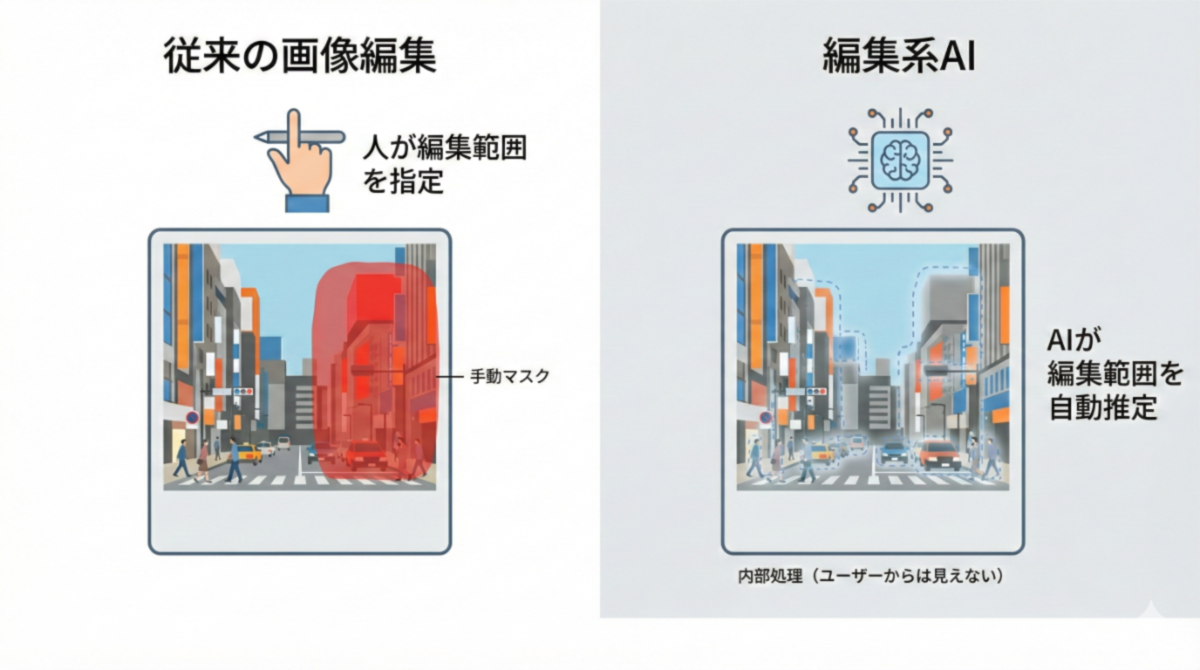 編集系AIでも、内部では編集対象となる領域を判定している。概念的にはマスクと同じ役割を果たす処理だ。ただし、その作業はユーザーの手を離れ、AI側で自動的に実行されるようになった。