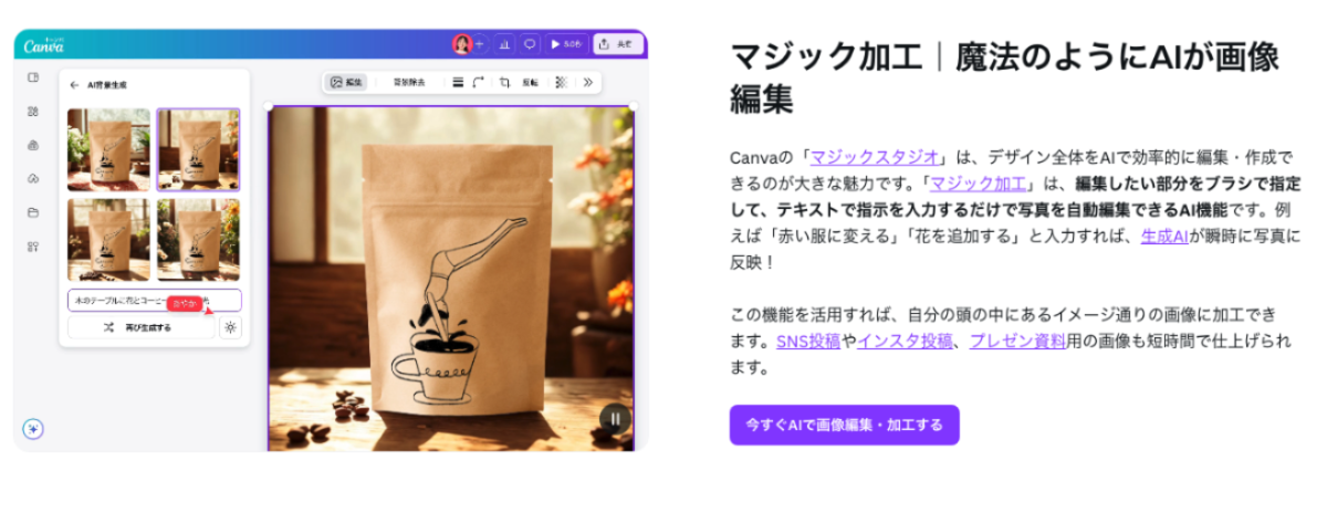 CanvaのAI編集で際立っているのは、画像内のオブジェクトを自由に動かせる「マジックつかみ(Magic Grab)」や、不要なものを瞬時に消し去る「マジック消しゴム」といった機能が、テンプレート編集のフローに完全に溶け込んでいる点だ。ユーザーは「加工」という意識を持つことなく、スライドやバナー上の写真を、まるで図形パーツを扱うような感覚で自在に再構成できる。