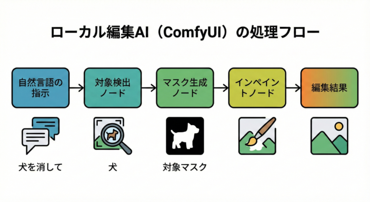 かつて手作業をしていた「目で判断して、範囲を選んで、描き直す」という工程を、複数のモデルの連携として再現している形だ。一度うまく動く形を作れば、同じ編集を何度でも再現できる。クラウド型のように「一言で全部やってくれる」手軽さはないが、その代わり、編集結果のブレを抑えやすい。