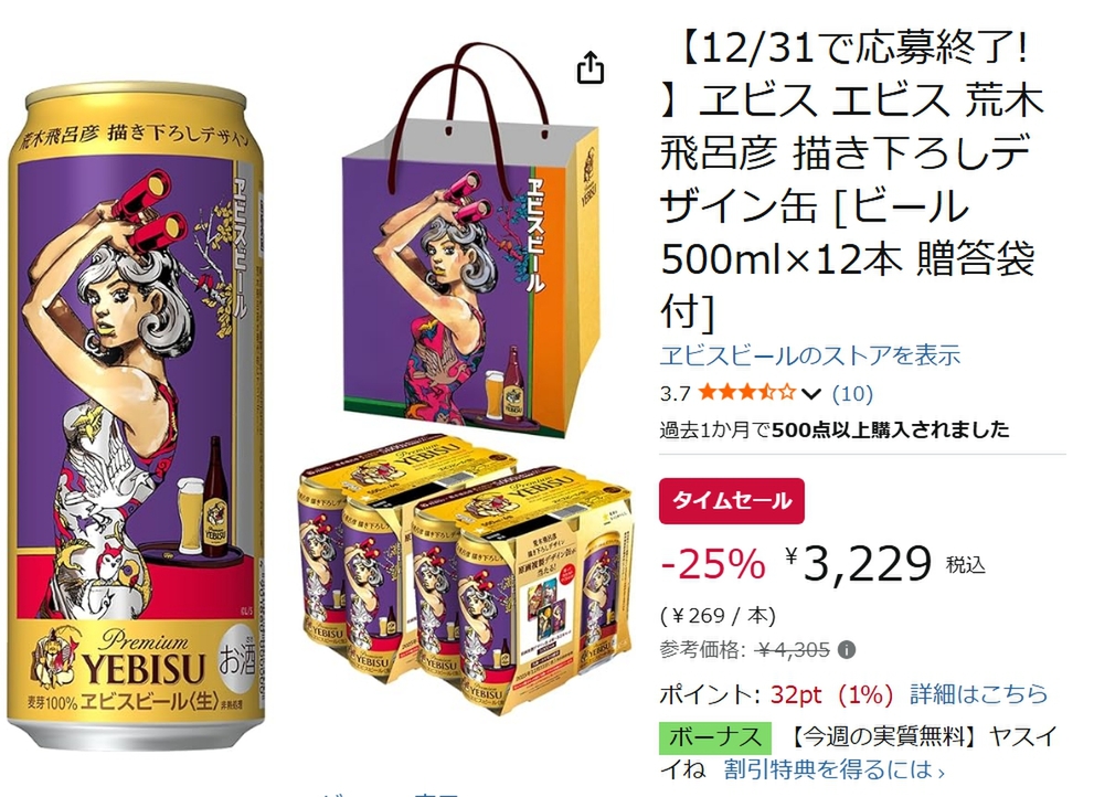 ヱビスビール500ml缶が12本入った贈答袋付きのセット商品「ヱビス 荒木飛呂彦 描き下ろしデザイン缶 [ビール 500ml×12本 贈答袋付]」がAmazonタイムセールに登場しています。